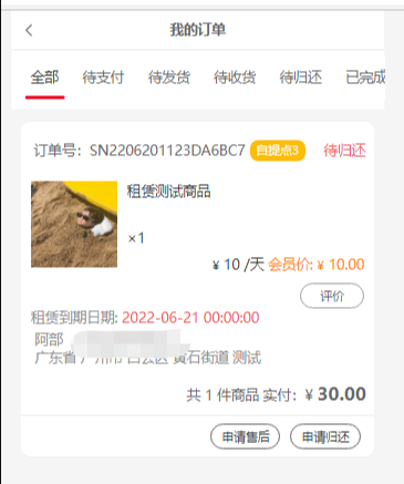 注意:租赁商品,选择快递配送,租赁商品到期日期是从 “确认收货时间” 开始统计;如果是 选择 自提点核销 ,租赁商品到期日期是从“扫码核销时间”开始统计