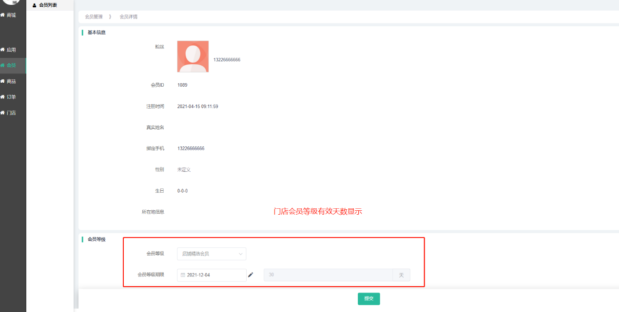(4)等级有效天数:门店会员等级可独自设置,其门下会员按门店会员等级有效天数显示。不受商城平台会员等级有效天数设置影响。如下图。